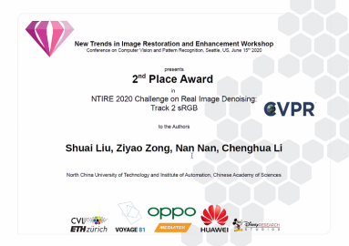 CVPR2020的Ntire Workshop中的DemoireingChallenge(去摩尔纹挑战赛),分为两个赛道:单图像以及连拍图像,Real Image Denoising(真实图像去噪挑战赛)也分为两个赛道:rawRGB和sRGB。平均每个赛道均有100多支国际队伍参赛,只取前三名的队伍予以奖励。研究生刘帅、南楠在众多参赛团队中脱颖而出,获得第二名,他们的相关学术论文也被大会录用。