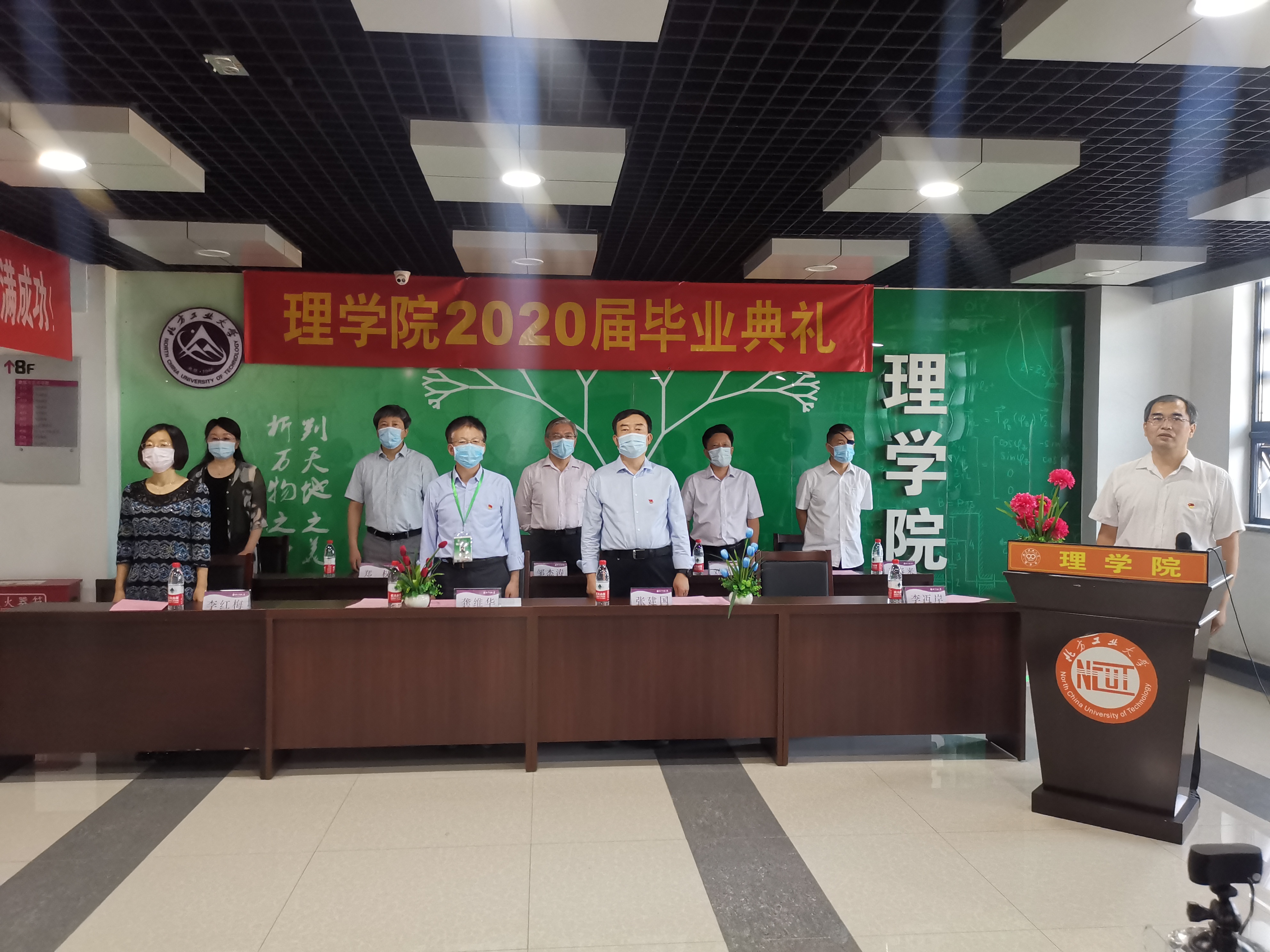 毕业典礼在国歌声中隆重开幕,现场全体老师肃立跟唱,在线的同学们在全国各地起立跟唱国歌。