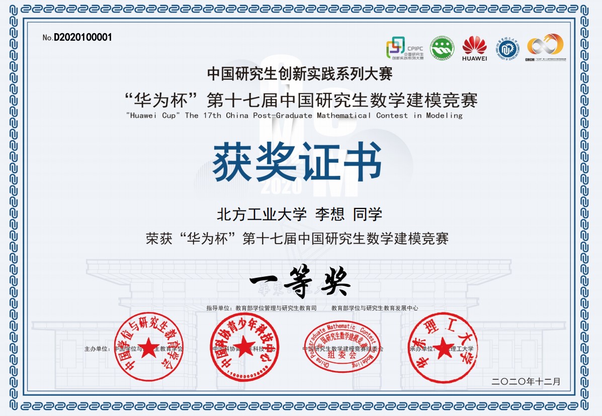 “华为杯”第十七届中国研究生数学建模竞赛成绩揭晓。太阳集团tyc4633研究生李想、张怡栋和李小白获得全国一等奖。