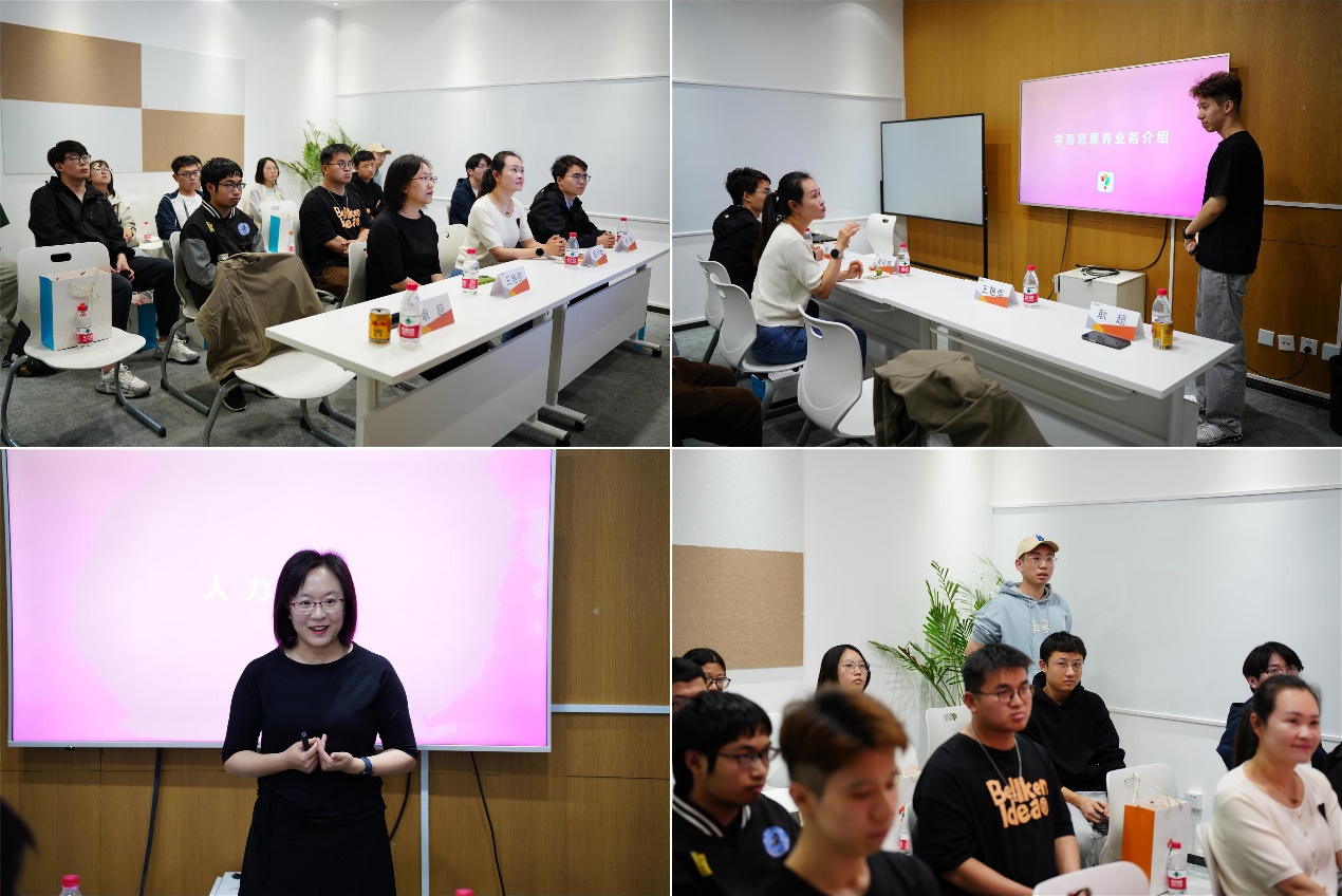 在座谈交流环节中,学而思员工备课组主管耿超老师介绍了学而思的发展历程,强调“学而思素养”以“激发兴趣”为核心价值,以“学以致用”为培养目标,致力于培养孩子面向未来的创造能力和科学家精神。人力资源部负责人王艳丽老师介绍了学而思的企业文化、晋升制度、福利待遇以及近期的用人需求和招聘情况等,同学们就招聘流程和培养机制等方面的困惑与学而思老师进行交流互动。学而思方面也积极回应了同学们的问题并对同学们未来应聘学而思相关岗位表示热烈的欢迎。