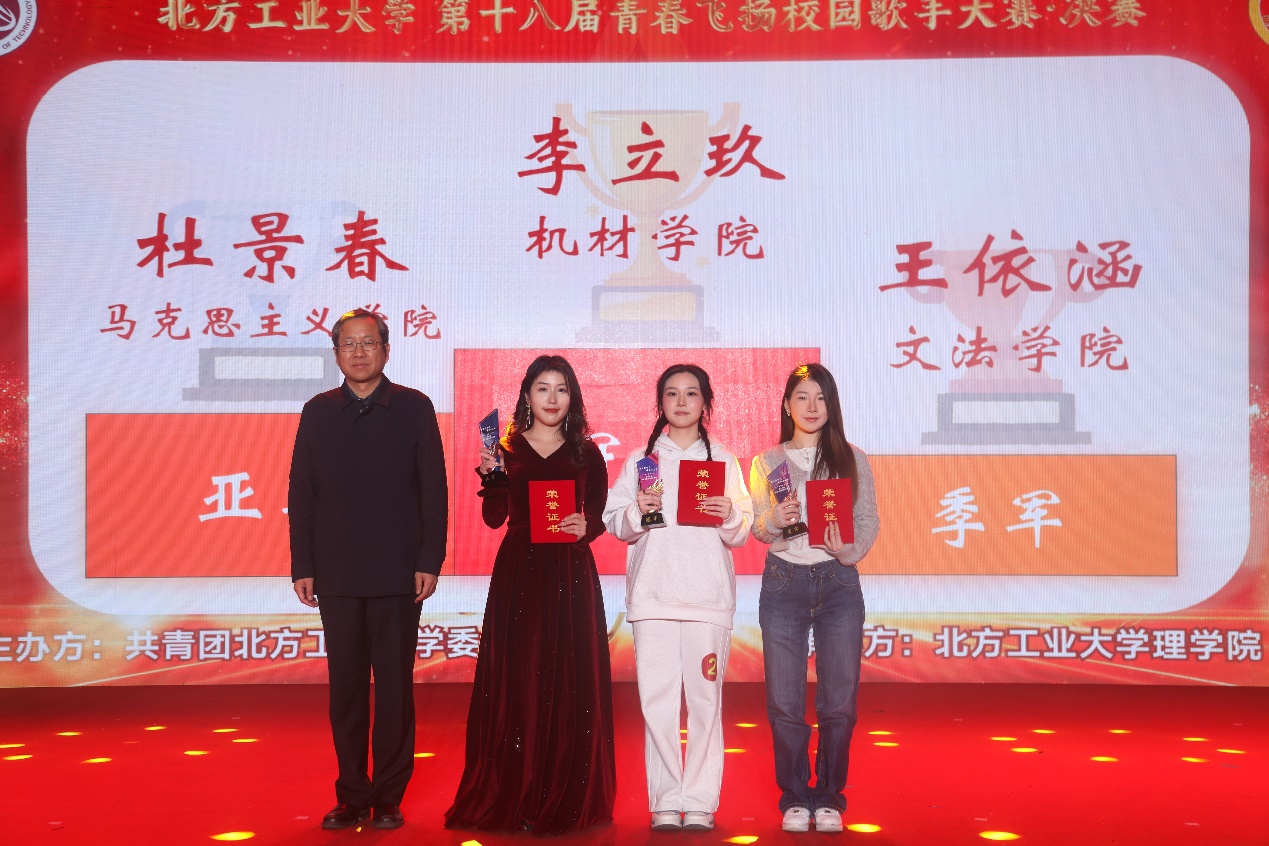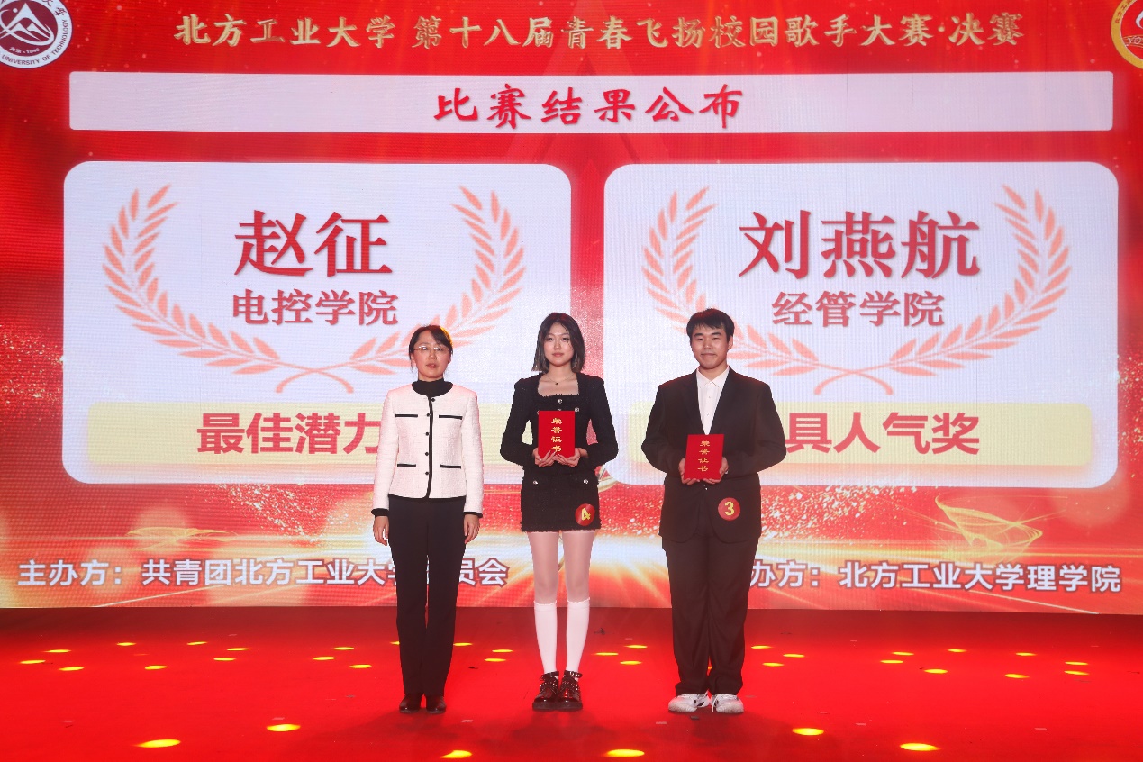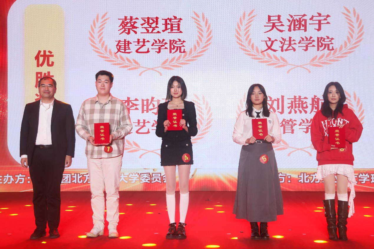 经过激烈比拼,最终李立玖,杜景春、王依涵分别获得了此次比赛的冠亚季军;赵征获得了最佳潜力奖,刘燕航获得了最具人气奖;蔡翌瑄、吴涵宇、李昀珂、刘燕航获得了优胜奖;校党委副书记史贞军、校团委书记杨超、太阳集团tyc4633院长李沍岸为获奖选手颁奖。