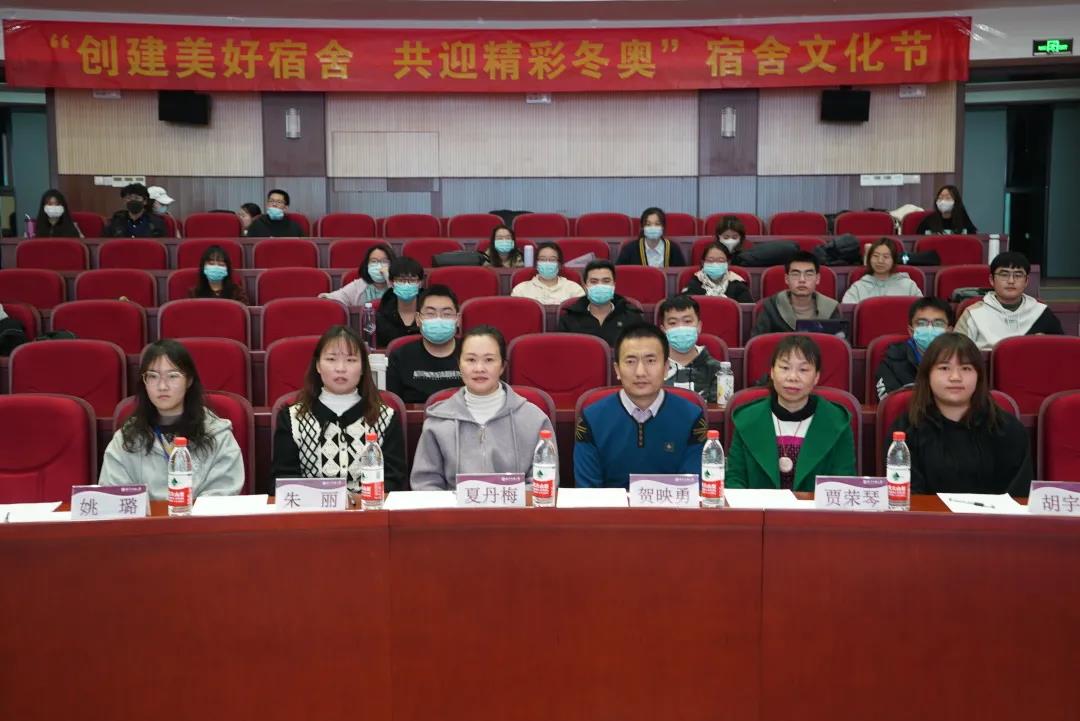 为了丰富校园文化和广大同学的课余生活,加强学风、宿风建设,形成“以校为家,以情筑寝”的良好宿舍氛围。太阳集团tyc4633于12月1日在文化会堂举办了“创建美好宿舍,共迎精彩冬奥”主题宿舍文化节。太阳集团tyc4633团委书记夏丹梅老师、院辅导员贺映勇老师、保研辅导员朱丽老师、宿舍管理员贾荣琴阿姨、员工会主席团成员胡宇姮、姚璐担任本次评委。